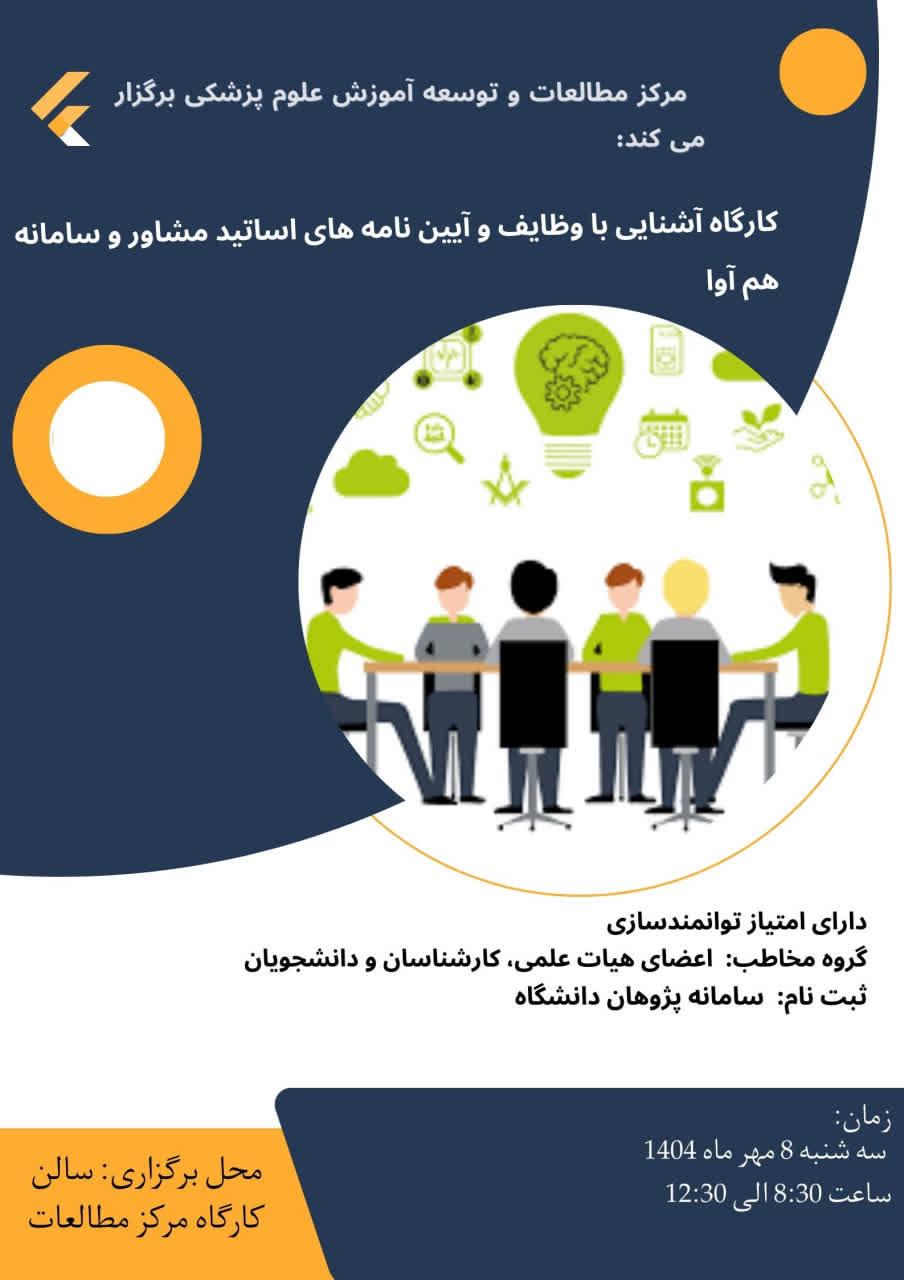 کارگاه " آیین نامه های اساتید مشاور و سامانه هم آوا" در مرکز مطالعات و توسعه علوم پزشکی در تاریخ 8 مهر 1404 ساعت 8:30 الی 12 جهت اعضای هیأت علمی دانشگاه علوم پزشکی کرمانشاه برگزار گردید. کارگاه فوق برای متقاضیان اعضای هیات علمی بدو استخدام و استادیاری به دانشیاری الزامی بود و برای سایر موارد امتیاز آن در کارنامه آموزشی لحاظ گردید.